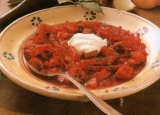 30 dg močing (zadné hov.mäso), 1,5 l vody, 2 PL masla, 1 PL oleja, 1 cibuľa, 20 dg koreňovej zeleniny, 3 strúčiky cesnaku, 20 dg bielej kapusty, 20 dg zemiakov, 3 PL paradajkového pretlaku, 30 dg cvikly, 2 paradjaky, niekoľko zrniek čierneho a nového korenia, 1 bobkový list, 2 PL citrónovej šťavy, sladká mletá paprika, štipľavá ml. paprika, vegeta, čierne ml. korenie, soľ, 250 g kyslej smotany, petržlen. vňať.